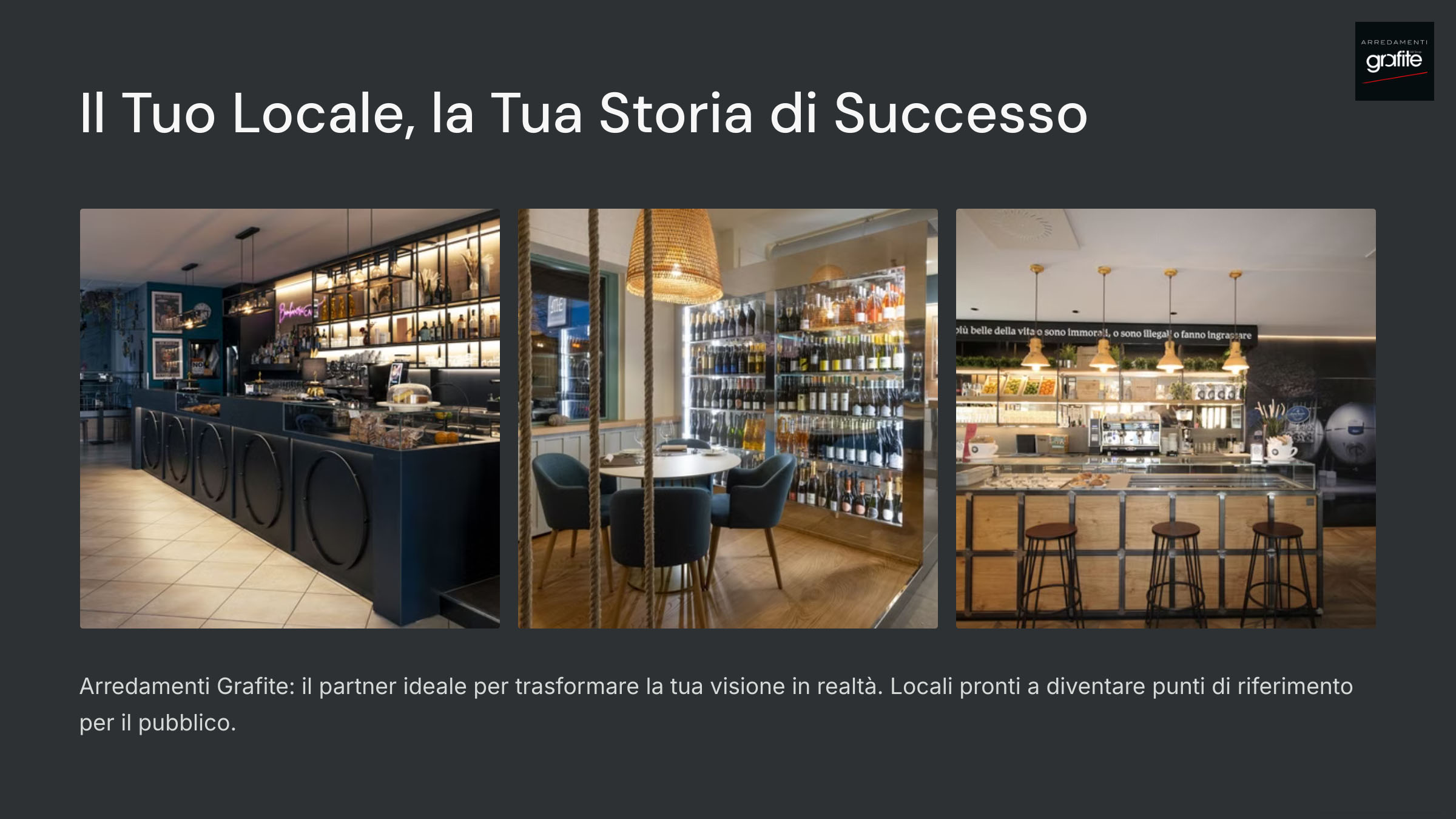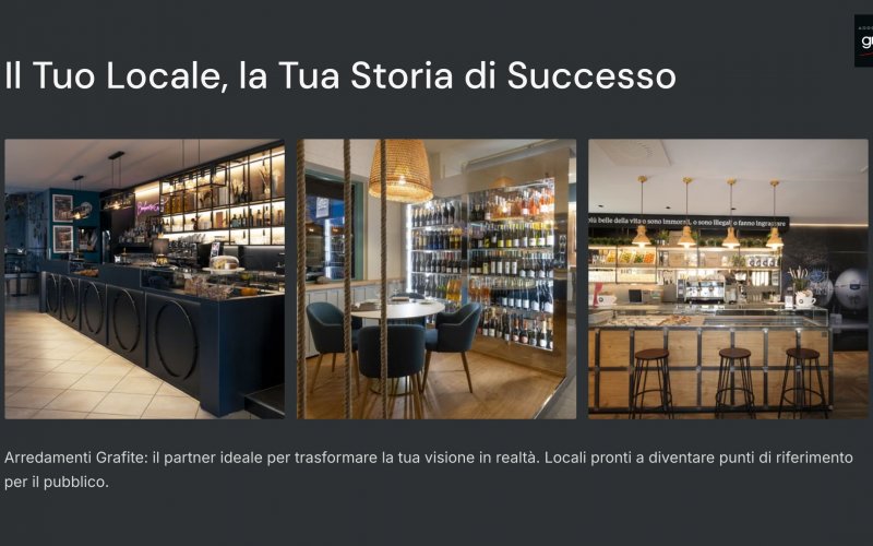 Arredamenti Grafite è sinonimo di progettazione e realizzazione di locali di successo. Questo non è solo il nostro slogan, ma il cuore pulsante del nostro lavoro. Ci occupiamo dell’arredamento di locali commerciali nel settore Food & Beverage, ma per noi l’arredo rappresenta l’ultima tappa di un percorso più ampio, che inizia fianco a fianco con i nostri clienti.