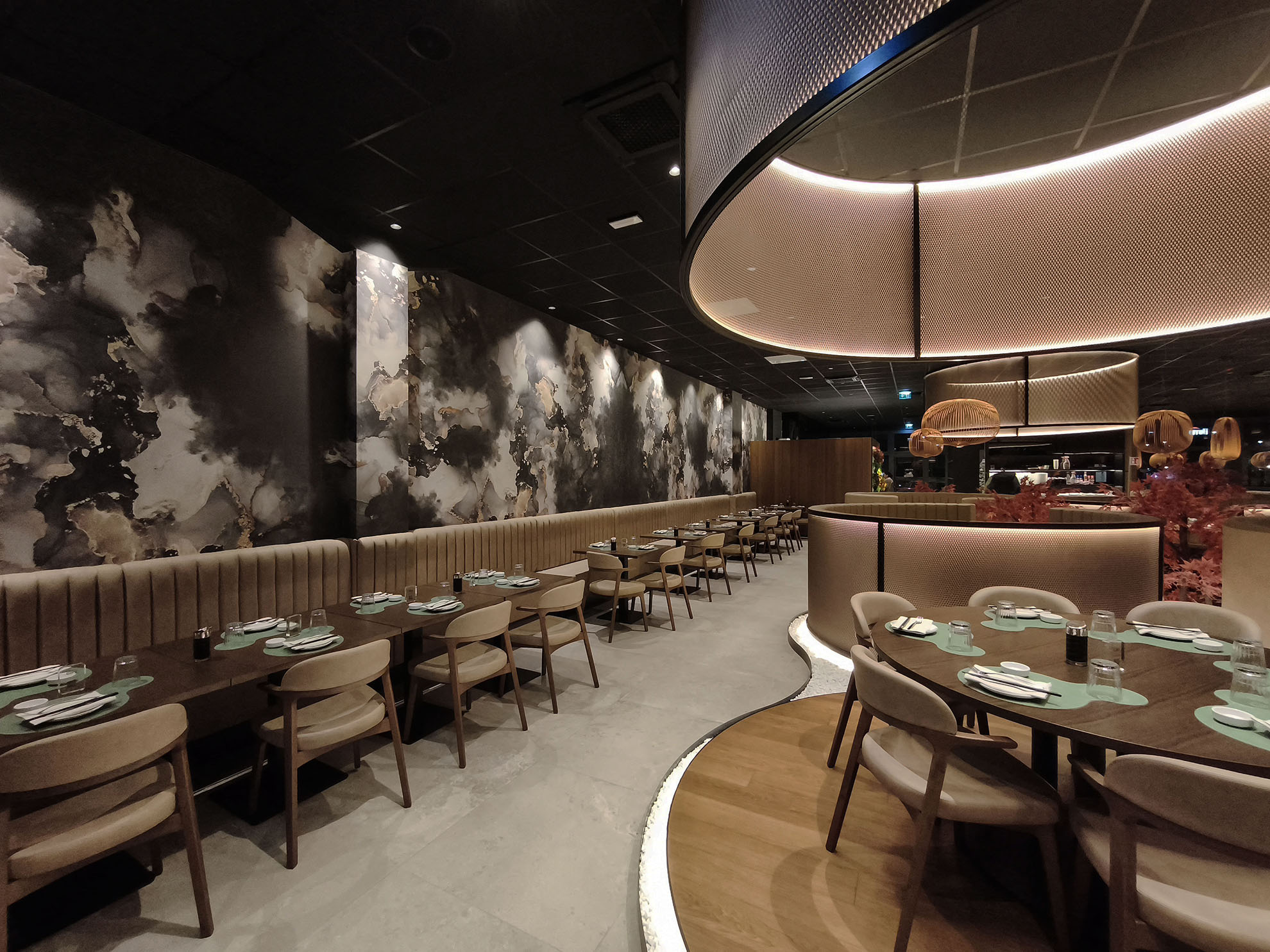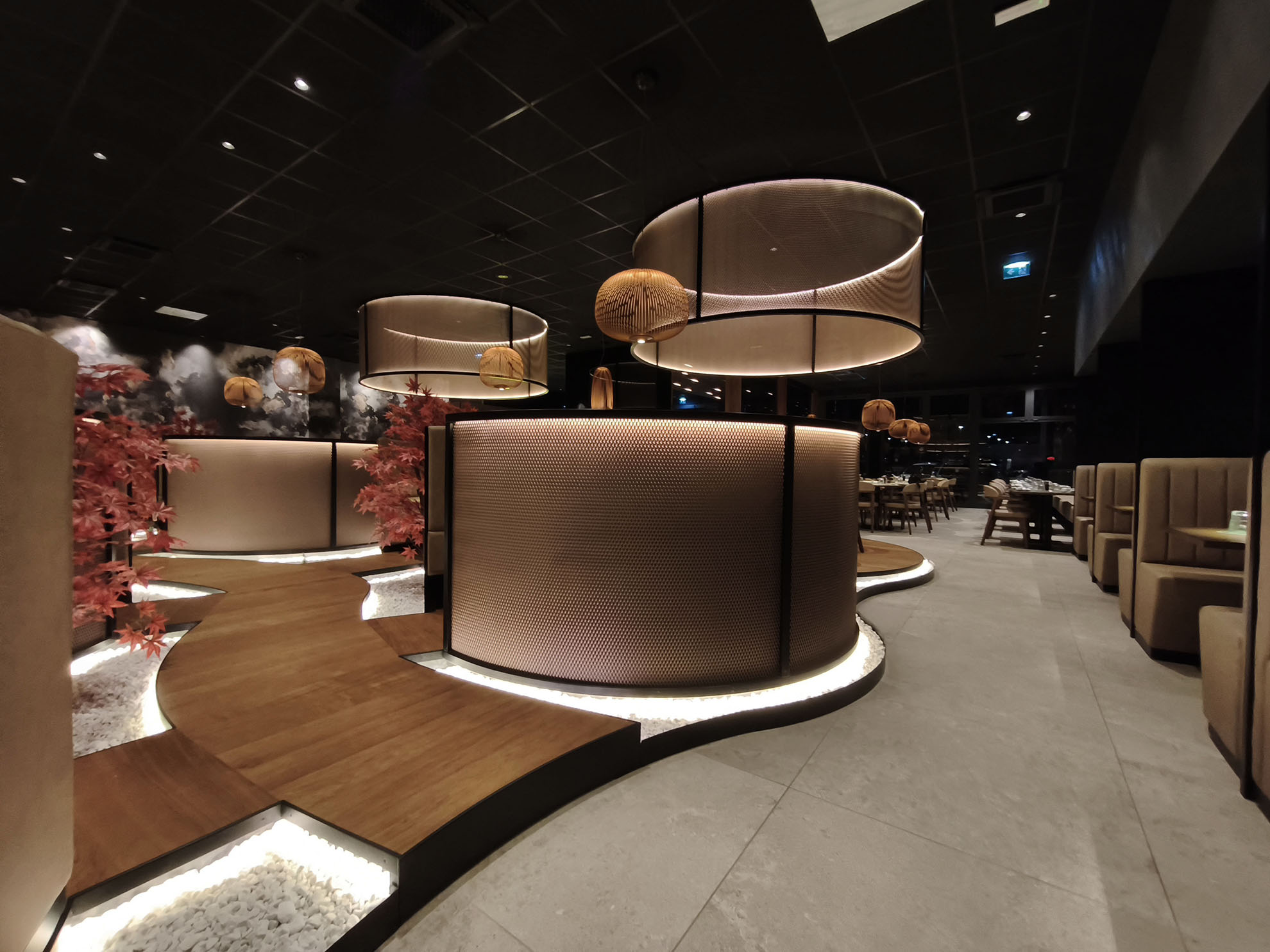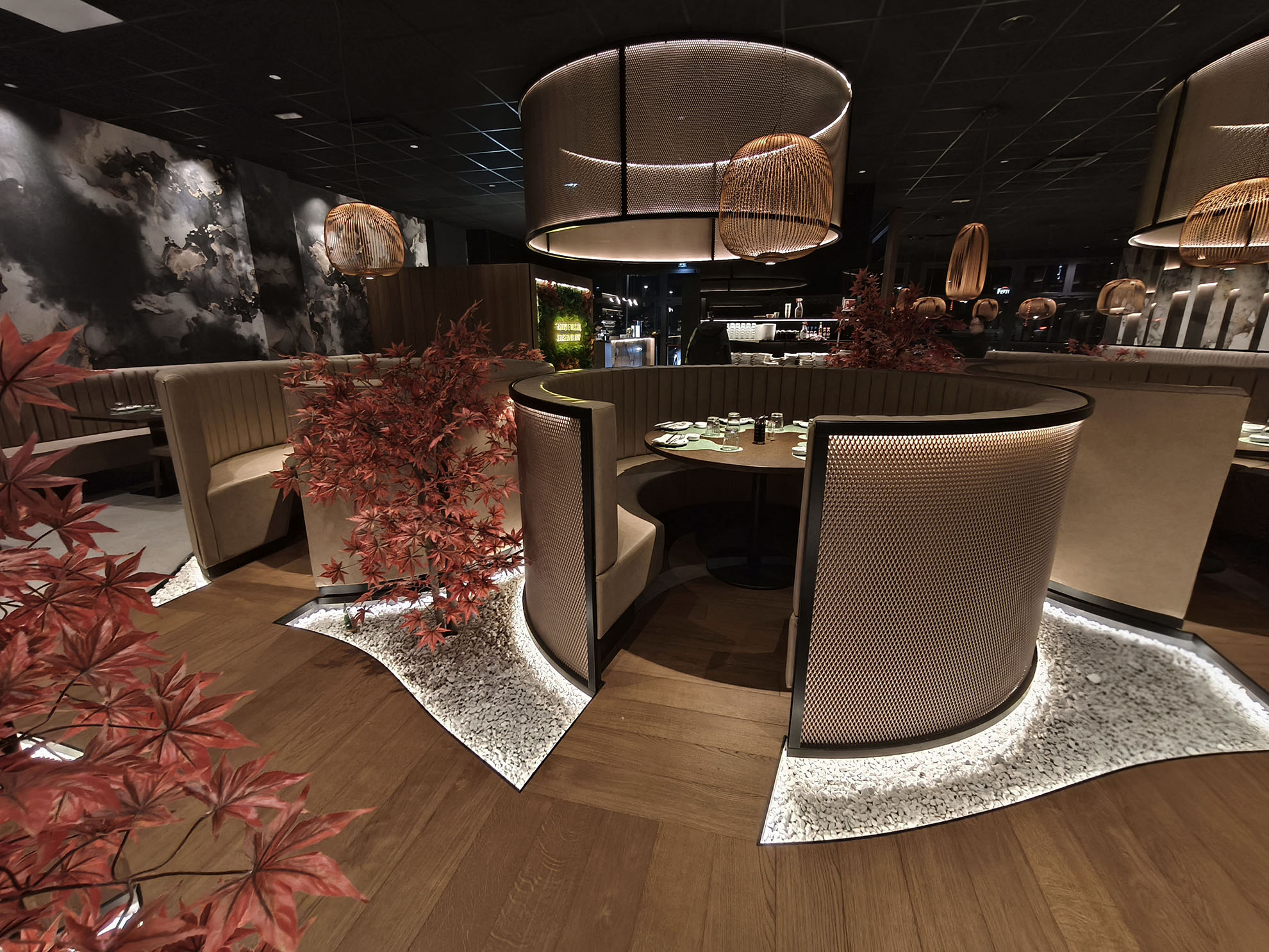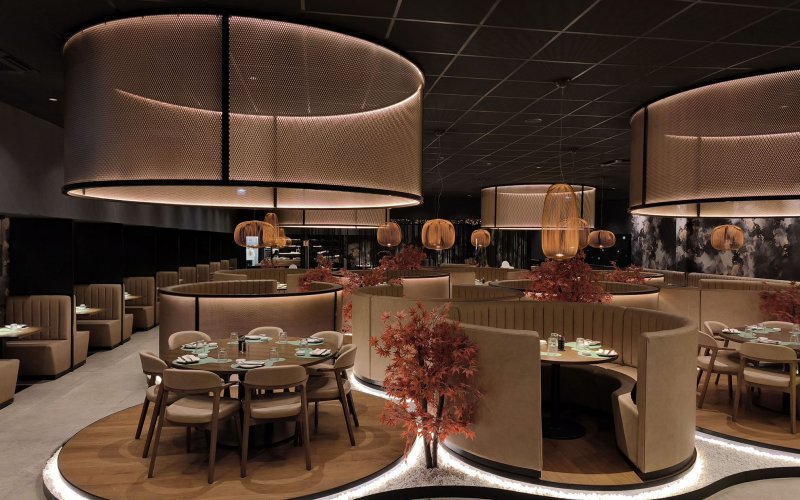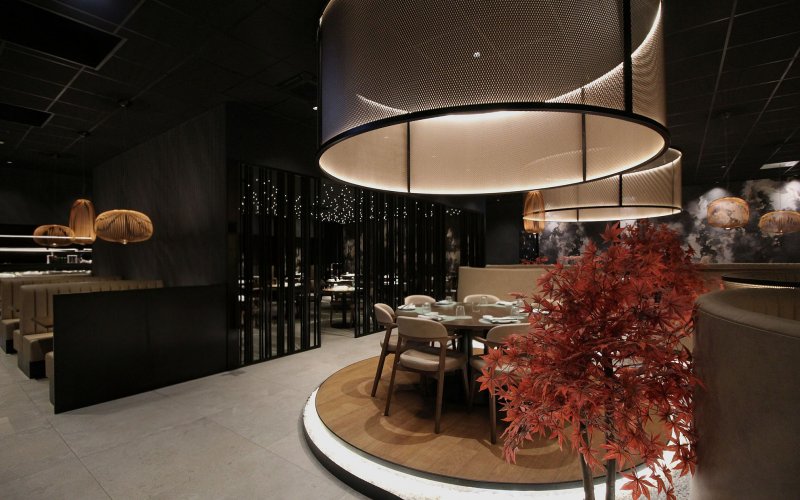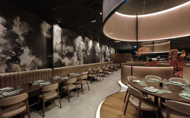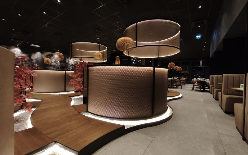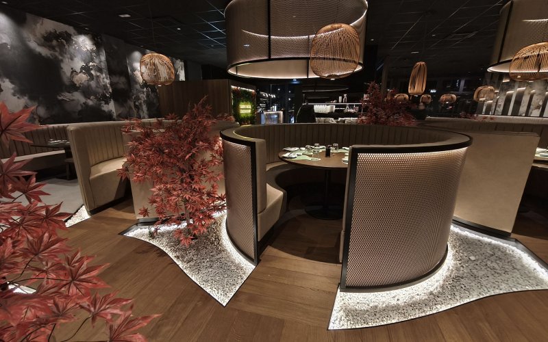 Progetto ex novo che trasforma un capannone industriale in un ristorante sushi dall’identità sofisticata, evoluzione del concept cromatico del brand. Cuore dello spazio è il garden centrale con aceri rossi, isole rialzate e panche tonde, che crea un’atmosfera intima e naturale. L’ingresso scenografico accompagna alle sale, tra pareti verdi con frase iconica a led, rivestimenti effetto pietra retroilluminati e una saletta coppie con cielo stellato. Ne nasce uno spazio immersivo, curato nei dettagli e fortemente identitario.