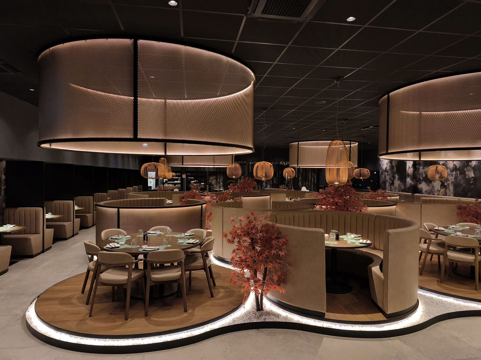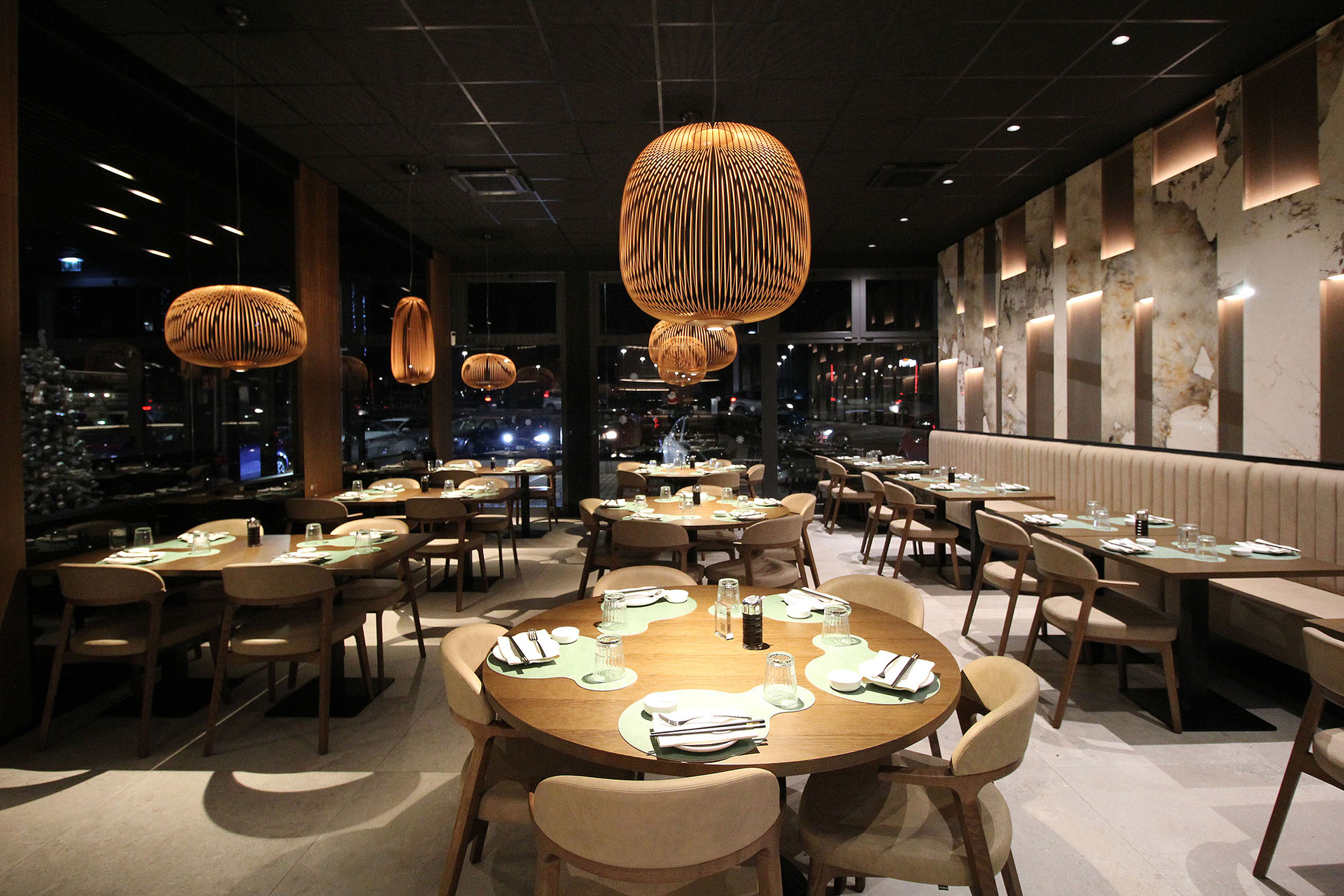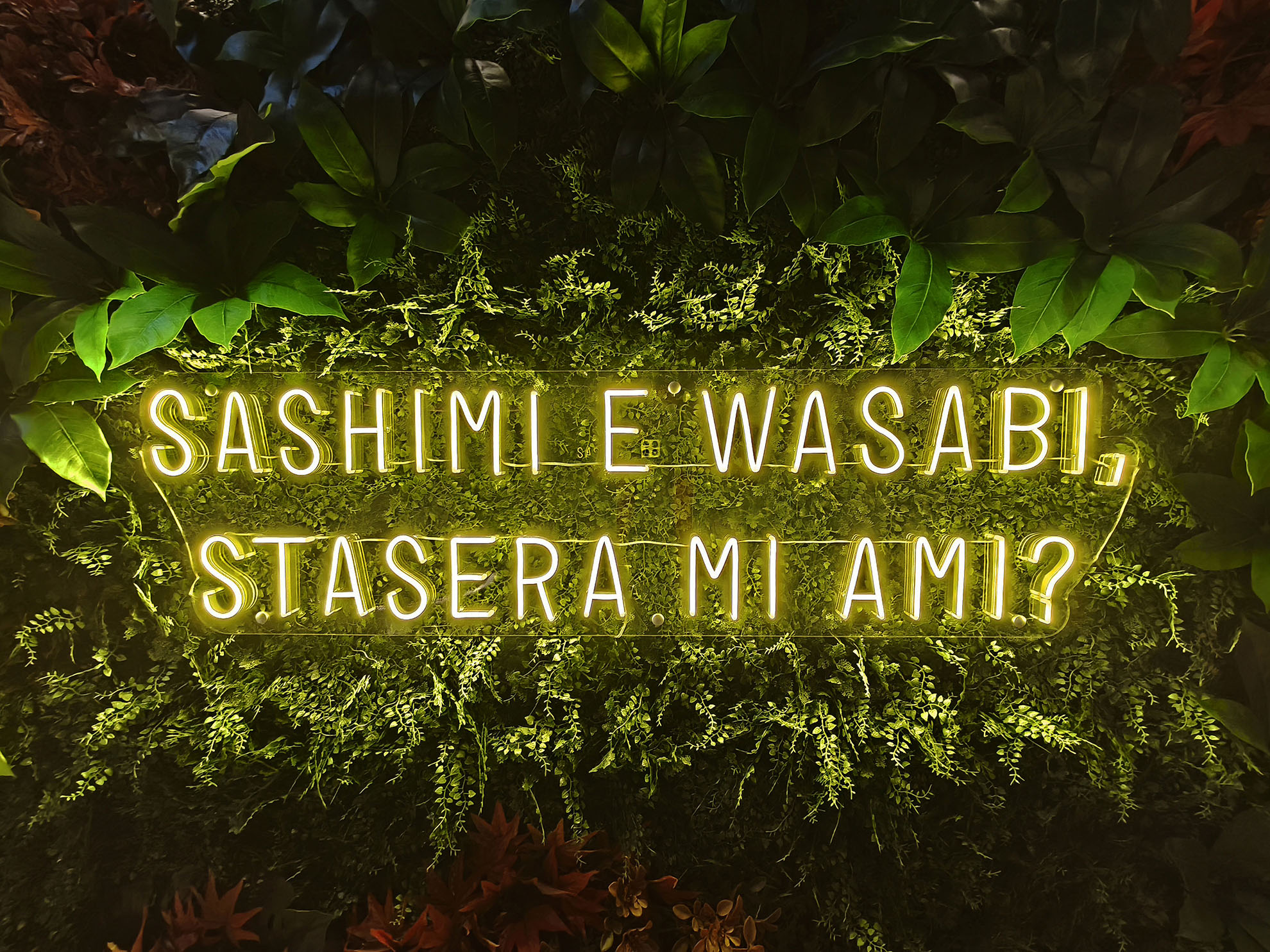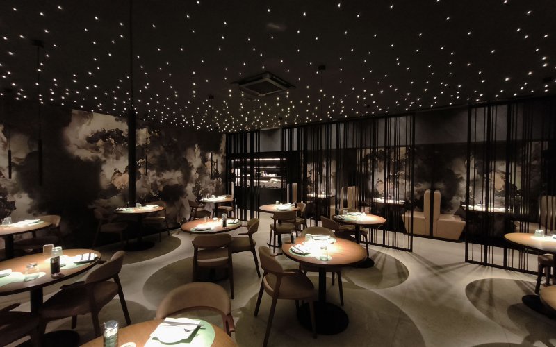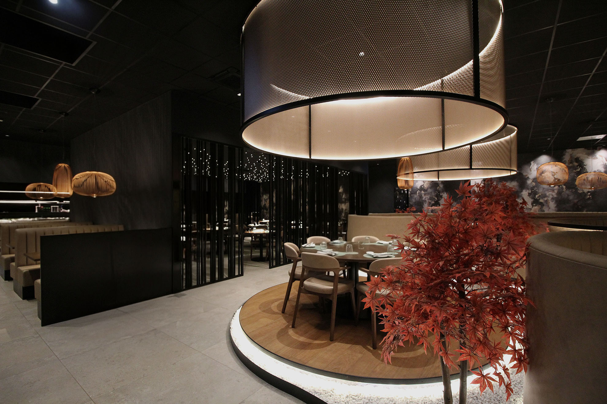 Progetto ex novo che trasforma un capannone industriale in un ristorante sushi dall’identità sofisticata, evoluzione del concept cromatico del brand. Cuore dello spazio è il garden centrale con aceri rossi, isole rialzate e panche tonde, che crea un’atmosfera intima e naturale. L’ingresso scenografico accompagna alle sale, tra pareti verdi con frase iconica a led, rivestimenti effetto pietra retroilluminati e una saletta coppie con cielo stellato. Ne nasce uno spazio immersivo, curato nei dettagli e fortemente identitario.