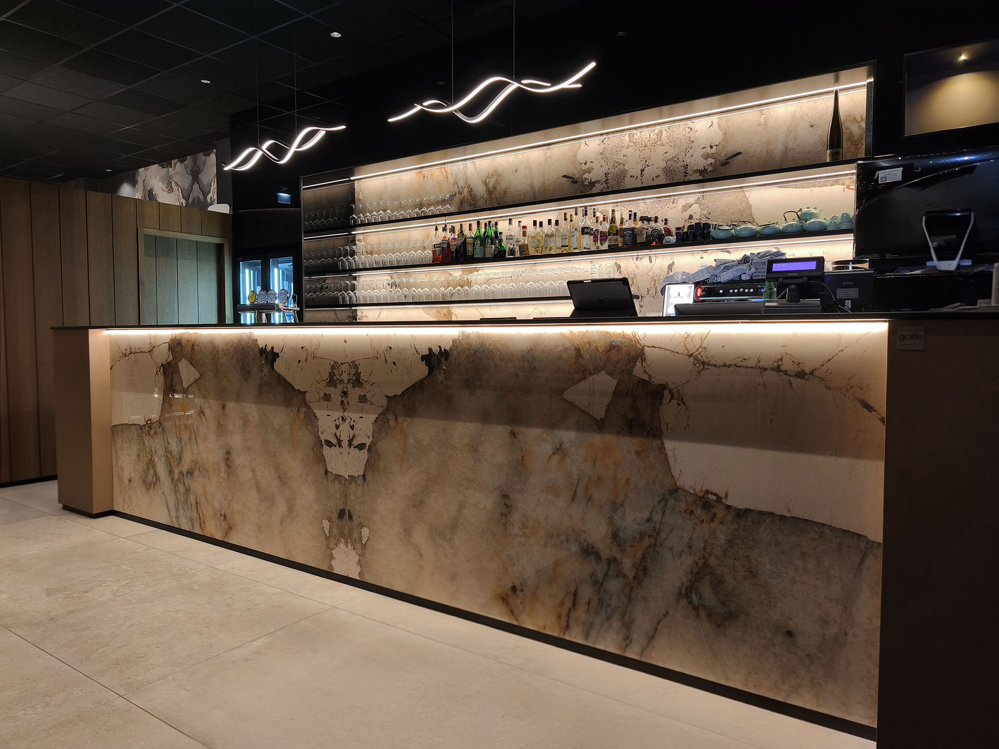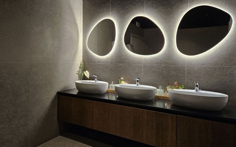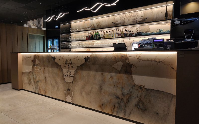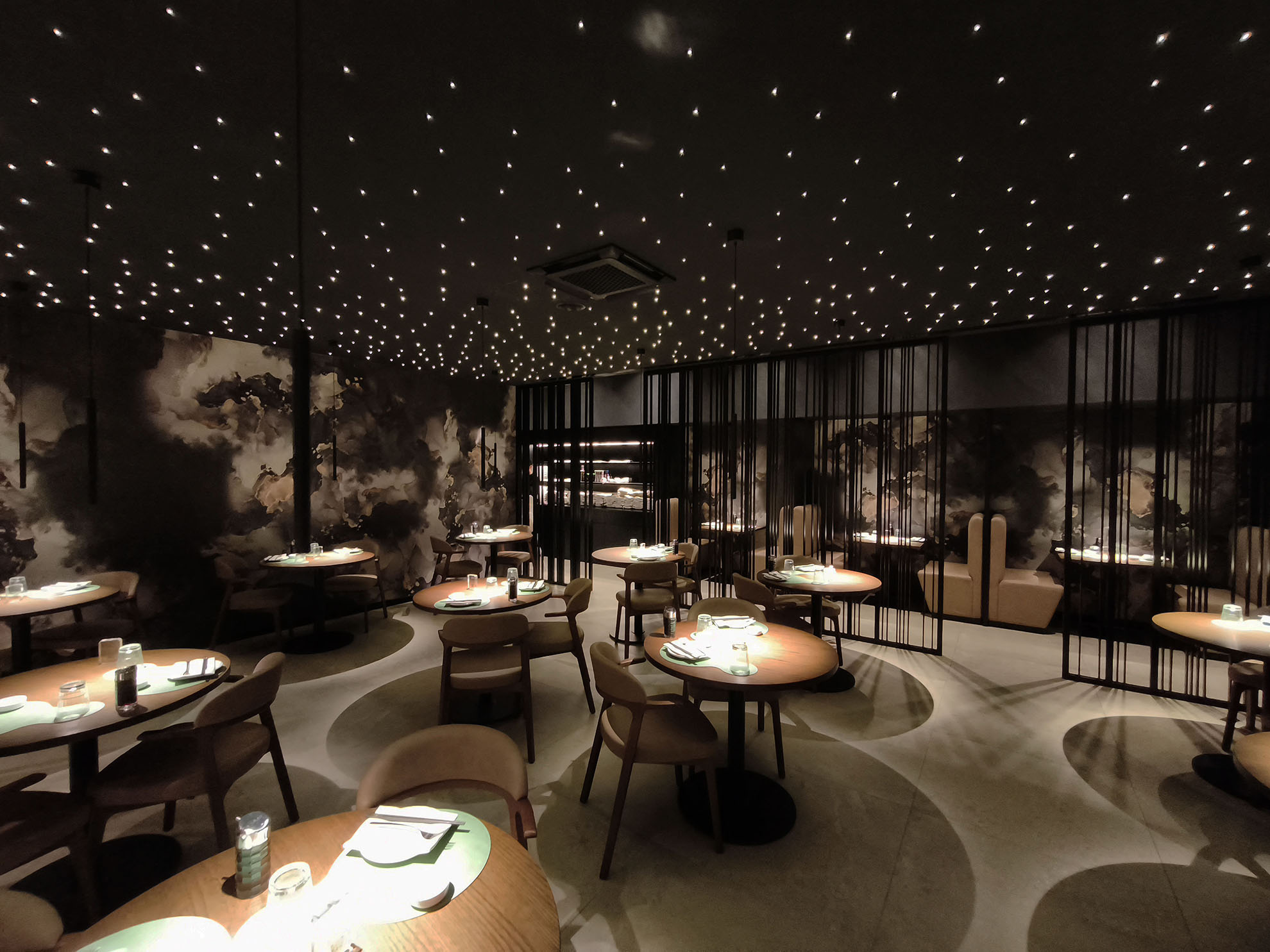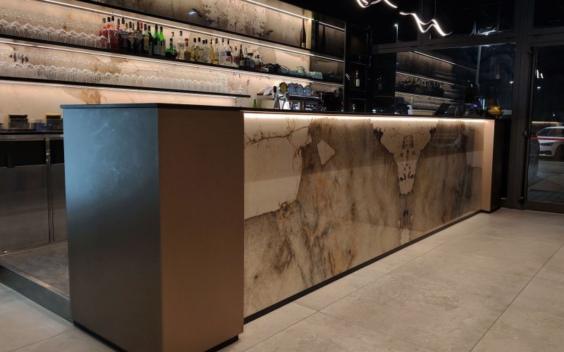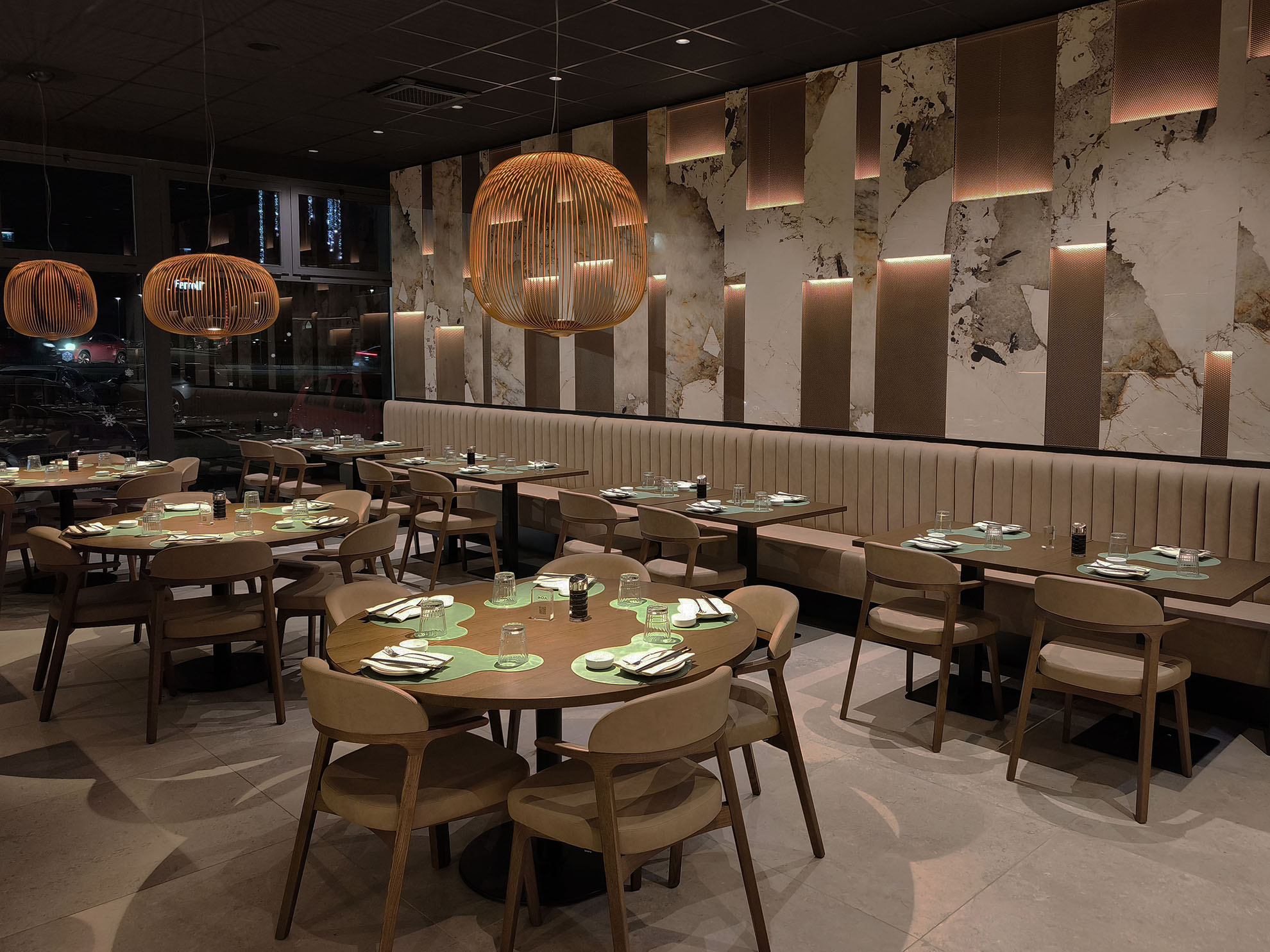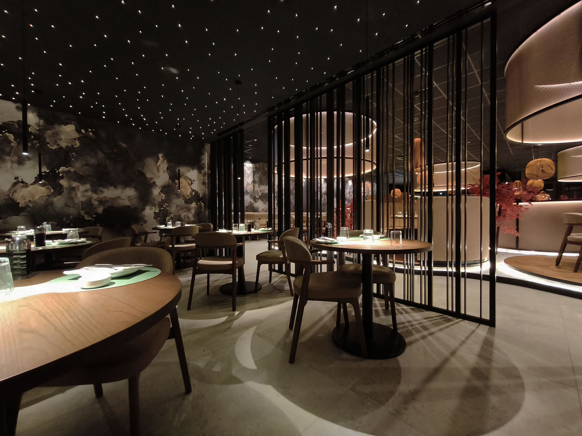 Progetto ex novo che trasforma un capannone industriale in un ristorante sushi dall’identità sofisticata, evoluzione del concept cromatico del brand. Cuore dello spazio è il garden centrale con aceri rossi, isole rialzate e panche tonde, che crea un’atmosfera intima e naturale. L’ingresso scenografico accompagna alle sale, tra pareti verdi con frase iconica a led, rivestimenti effetto pietra retroilluminati e una saletta coppie con cielo stellato. Ne nasce uno spazio immersivo, curato nei dettagli e fortemente identitario.